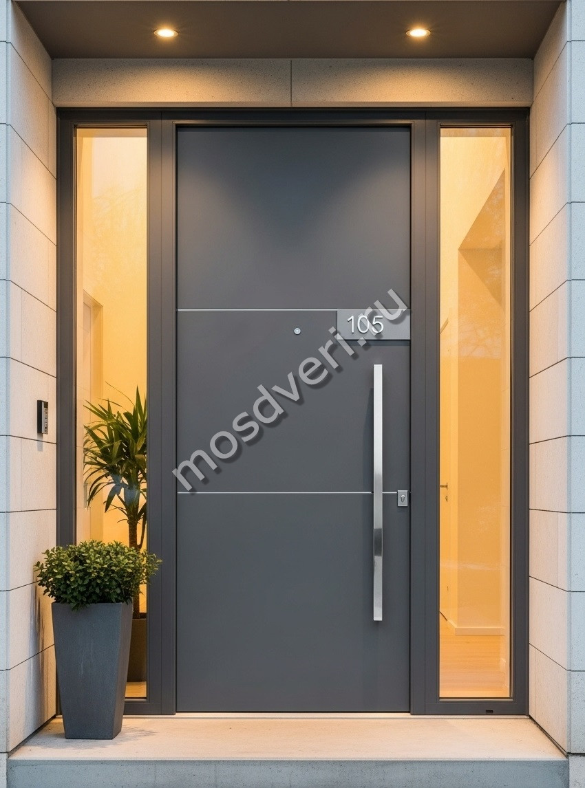 Большая входная дверь в дом серая — совмещает современный дизайн и максимальную защиту.